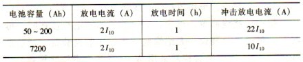 1)100%容量沖擊電流放電能力。當蓄電池容量達到滿容量時,對容量為50~200Ah的電池用25I10沖擊電流值,容量大于200Ah的電池用20I10沖擊電流值,沖擊l0次,每次500ms的沖擊放電,每兩次放電時間問隔為2s,直流母線的電壓不得低于90%UN(UN為直流系統額定電壓)。