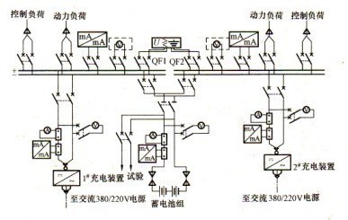 (3)方案三:單母線分段(一組蓄電池,兩套充電裝置)接線,見圖2-3。特點:接線可靠、靈活,一組蓄電池經兩個空氣斷路器分別接到兩段母線上。兩套相同容量的充電裝置接在不同